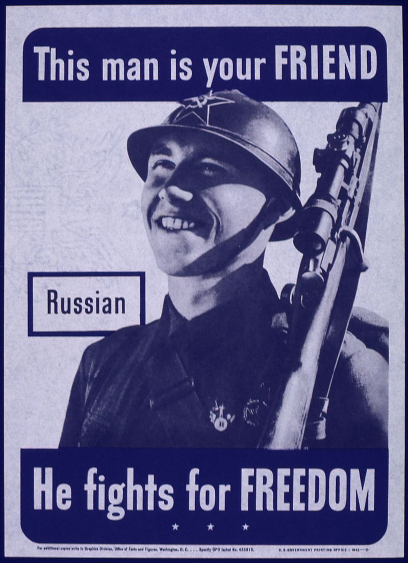 – Конечно, фактор общего врага очень многое заставил пересмотреть. Иерархия ценностей при принятии решений и в США, и в СССР немедленно изменилась после того, как началась война. Идеология вдруг оказалась не такой важной в отношениях друг с другом. Я бы вообще сказал, что когда на международной арене хотя бы относительный мир, локальные какие-то войны, но не лобовое столкновение крупнейших держав, то очень часто внешнеполитическая риторика играет подчиненную роль, является производным того, что происходит во внутренней политике. Обвинять другую страну, иногда рисовать ее полностью черной краской – это нормально в том смысле, что это постоянно повторяющаяся модель конструирования образа Другого. В мирное время это работает и постоянно присутствует в политике, используется для достижения в том числе внутриполитических целей. А вот когда оказывается, что международные отношения скатились в войны между крупнейшими державами, то в этот момент эта риторика уступает место прагматике и пропаганда оказывается подчинена решению больших проблем. Мы можем проследить, как в конце 1941-го и в 1942 году резко меняется всякая пропагандистская деятельность в обеих странах относительно друг друга. В Соединенных Штатах, например, Голливуд начинает снимать в 1942–43 годах очень просоветские фильмы.
