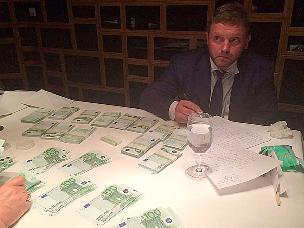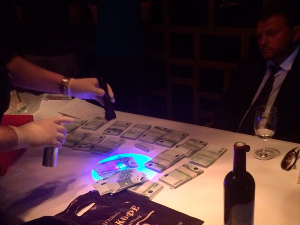 Лицо губернатора пунцовое, рядом бокал с водой и комок использованных влажных салфеток. Перед чиновником пачки с купюрами по 100 евро, сидящая напротив женщина пересчитывает деньги. На двух других фотографиях сотрудник в перчатках светит ультрафиолетовым фонариком на купюры, а затем на руки губернатора. На снимках не разобрать, но ультрафиолет в таких случаях должен выявлять краску, которой помечаются купюры для подставной взятки.