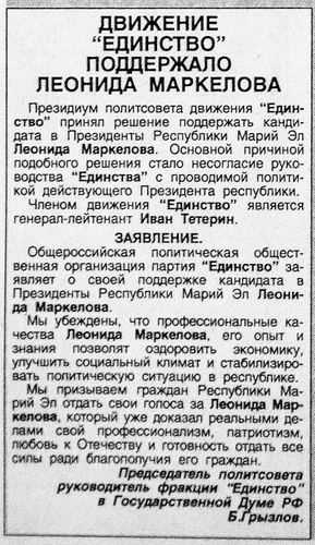 Общероссийская политическая общественная организация партия "Единство" заявляет о своей поддержке кандидата в Президенты Республики Марий Эл Леонида Маркелова. Мы убеждены, что профессиональные качества Леонида Маркелова, его опыт и знания позволят оздоровить экономику, улучшить социальный климат и стабилизировать политическую ситуацию в республике. Мы призываем граждан Республики Марий Эл отдать свои голоса за Леонида Маркелова, который уже доказал реальными делами свой профессионализм, патриотизм, любовь к Отечеству и готовность отдать все силы ради благополучия его граждан. Председатель политсовета руководитель фракции "Единство" в Государственной Думе РФ Б. Грызлов.