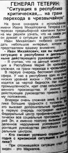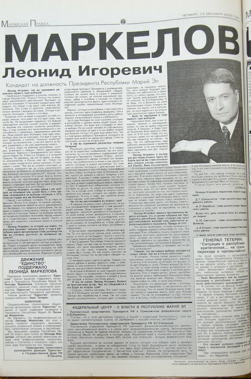 Предвыборное интервью будущего главы Марий Эл. Газета "Марийская Правда" 14 декабря 2000 г. До начала Маркеловской власти остается три дня.