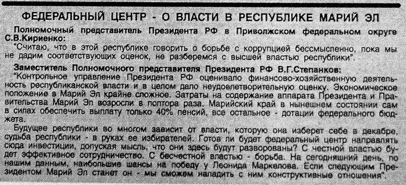 ФЕДЕРАЛЬНЫЙ ЦЕНТР - О ВЛАСТИ В РЕСПУБЛИКЕ МАРИЙ ЭЛ Полномочный представитель Президента РФ в Приволжском федеральном округе С.В.Кириенко: «Считаю, что в этой республике говорить о борьбе с коррупцией бессмысленно, пока мы не дадим соответствующих оценок, не разберемся с высшей властью республики». Заместитель Полномочного представителя Президента РФ В.Г.Степанков: «Контрольное управление Президента РФ оценивало финансово-хозяйственную деятельность республиканской власти и в целом дало неудовлетворительную оценку. Экономическое положение в Марий Эл крайне сложное. Затраты на содержание аппарата Президента и Правительства Марий Эл возросли в полтора раза. Марийский край в нынешнем состоянии сам в силах обеспечить выплату только 40% пенсий, все остальное - дотации федерального бюджета. Будущее республики во многом зависит от власти, которую она изберет себе в декабре, судьба республики - в руках ее избирателей. Готов ли будет федеральный центр направлять сюда инвестиции, допуская мысль, что они здесь будут разворованы?