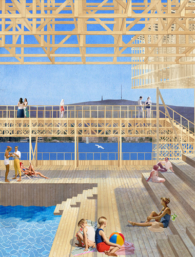 © Studio Tom Emerson Студия Тома Эмерсона (в сотрудничестве со студентами-архитекторам ETH Zurich). Павильон отражений. 2015—2016. Визуализация проекта При этом документация о процессе создания этих работ, составляющая вечернюю программу построенного на Цюрихском озере специально для «Манифесты» плавучего «Павильона отражений», удачно дополняет дневную функцию павильона, предназначенного для купания и принятия солнечных ванн.