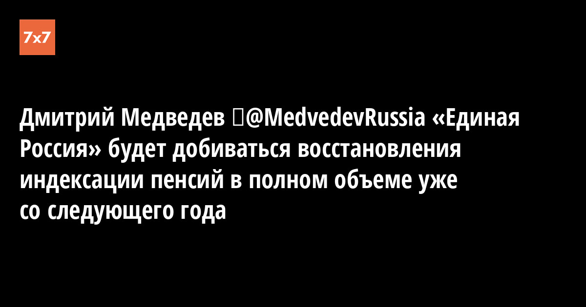 Дмитрий Медведев @MedvedevRussia «Единая Россия» будет добиваться восстановления индексации пенсий в полном объеме уже со следующего года