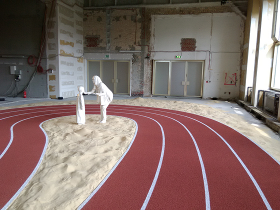 География Берлинской биеннале такова: четыре регулярные площадки (KW, Академия искусств, ESMT — Европейская школа менеджмента и технологий, The Feuerli Collection) и прогулочная лодка, плавающая по Шпрее. Не думаю, что стоит искать символизм в выборе тех или иных площадок, разве что нынешнее содержание ESMT и история здания, где располагается школа, удачно резонируют с тем искусством, которое там показывается, — проектом американцев Саймона Денни и Линды Кантчев «Визионеры блокчейна» и инсталляцией группы GCC из Объединенных Арабских Эмиратов «Пути одобрения». Эти работы, расположенные в здании с витражами, на которых изображены сцены классовой борьбы, портреты Розы Люксембург и Карла Либкнехта, объединены темой корпоративной культуры и либертарианской утопии и в общем-то задаются вопросом, что бы было в мире, где не осталось государств и иных управляющих или контролирующих органов, а только бизнес-структуры. В работе GCC по пустыне проложены пронумерованные беговые дорожки — образ конкуренции, а в центре стоит женщина, идеологизирующая своего ребенка банальностями корпоративной мотивационной психологии. У Кантчев и Денни проект более комплексный, несколько инсталляций совмещают в себе элементы ярмарочных стендов и конференций, где проходят презентации проектов, которые рассказывают о будущем, уже ставшем настоящим, то есть в некотором роде адресата этих посланий просто ставят перед фактом: все вы будете подключены к глобальному «свободному рынку» через все более «эффективные» цепочки сетевых транзакций — и приводятся примеры таких систем. Эти два проекта хорошо иллюстрируют общий настрой биеннале. Обычно кураторские подходы, к которым зрители привыкли по другим биеннале и выставкам, состоят в том, чтобы предложить альтернативу или сформулировать критическое осмысление этих явлений (через определенное сочетание работ или выбор конкретных «точных» проектов), но в планы DIS ни первое, ни второе не входило. Они вообще не спешат занимать какую-либо позицию по отношению ко всем тем явлениям, которые происходят, и художников они приглашали с похожим подходом. Мы-то полагали, что такое возможно только на странных проектах типа «Романтического реализма», но в сфере современного искусства — и, главное, без какого-то давления сверху — это также с легкостью происходит.
