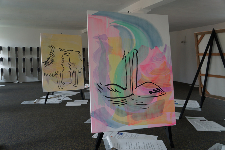 По этой же причине в основе большинства работ были мемы или какие-то похожие, застрявшие в голове вещи. Начиналось все с пародийной работы Хуана Себастьяна Пелаэса во дворе KW — это своего рода инстаграм-приманка, сделанная по аналогии с пресс-воллом. Разошедшееся по сети фото Рианны на пляже чуть искажено, увеличено до внушительных размеров и поставлено в удачном, практически по маркетинговой стратегии, месте. В некотором роде это апофеоз всей выставки, поскольку она рассчитана прежде всего на съемку селфи в экспозиции и забавных кадров, а не на какой-то дальнейший мыслительный процесс. В Академии искусств эта же стратегия привлекательности для Инстаграма доведена до предела — на первом этаже стоят лайтбоксы с горящей бейсболкой в поддержку Дональда Трампа и прочими запоминающимися кадрами.