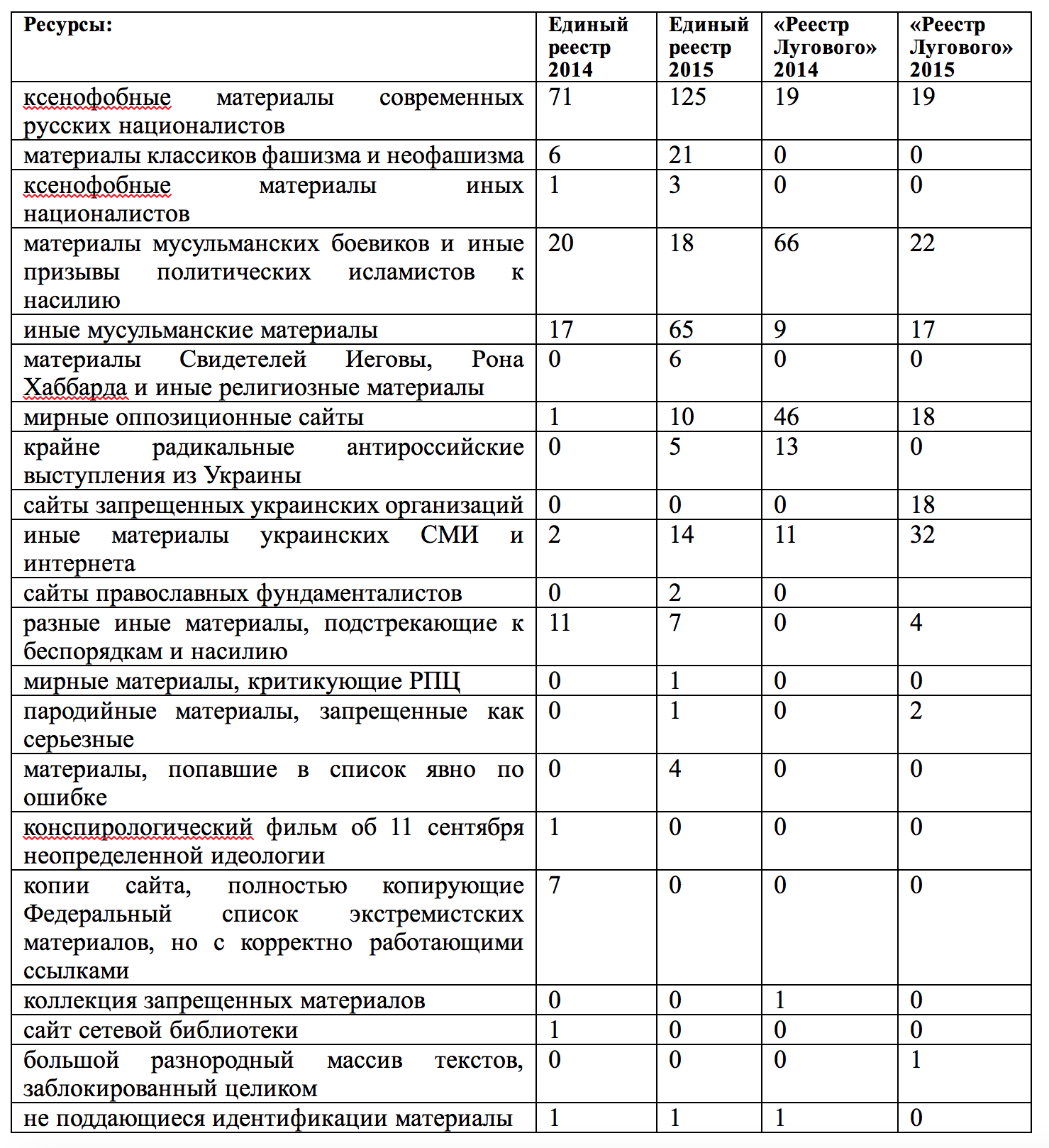В 2014 году внесение в реестр примерно 20 пунктов представляется нам сомнительным или вовсе неправомернымlii. В 2015 году нам представляется неправомерным внесение в реестр уже 72 ресурсовliii.
