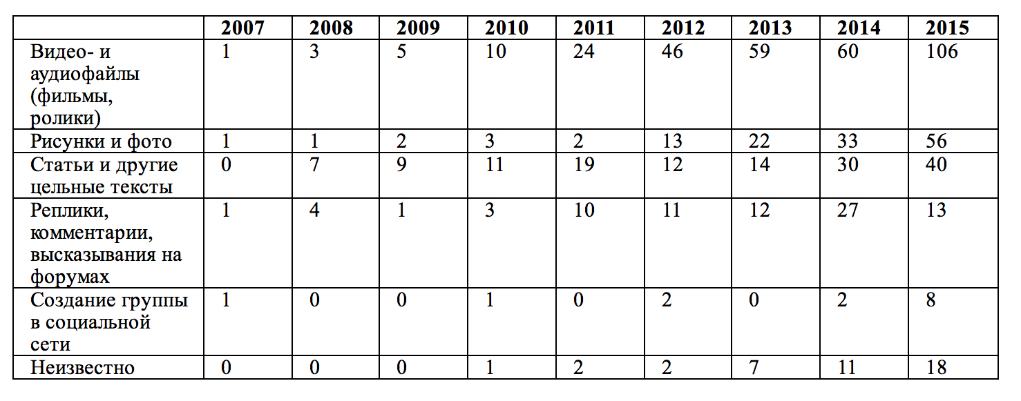 Уголовное преследование является наиболее сильной мерой в борьбе государства с «экстремистскими высказываниями» в интернете. «Экстремистскими» мы можем для краткости называть высказывания, за которые кто-то был осужден по статьям, относящимся к антиэкстремистскому законодательствуvii или которые вызвали меры антиэкстремистского административного реагирования, не затрагивая пока ни политологической оценки этих высказываний, ни нашей правовой оценки правомерности всех этих действий (и о том, и о другом речь пойдет ниже).