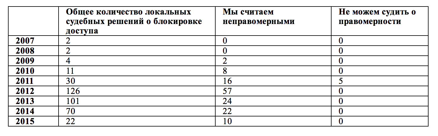 В таблице представлены данные о таких локальных судебных блокировках с 2007 по 2015 годxlvii: