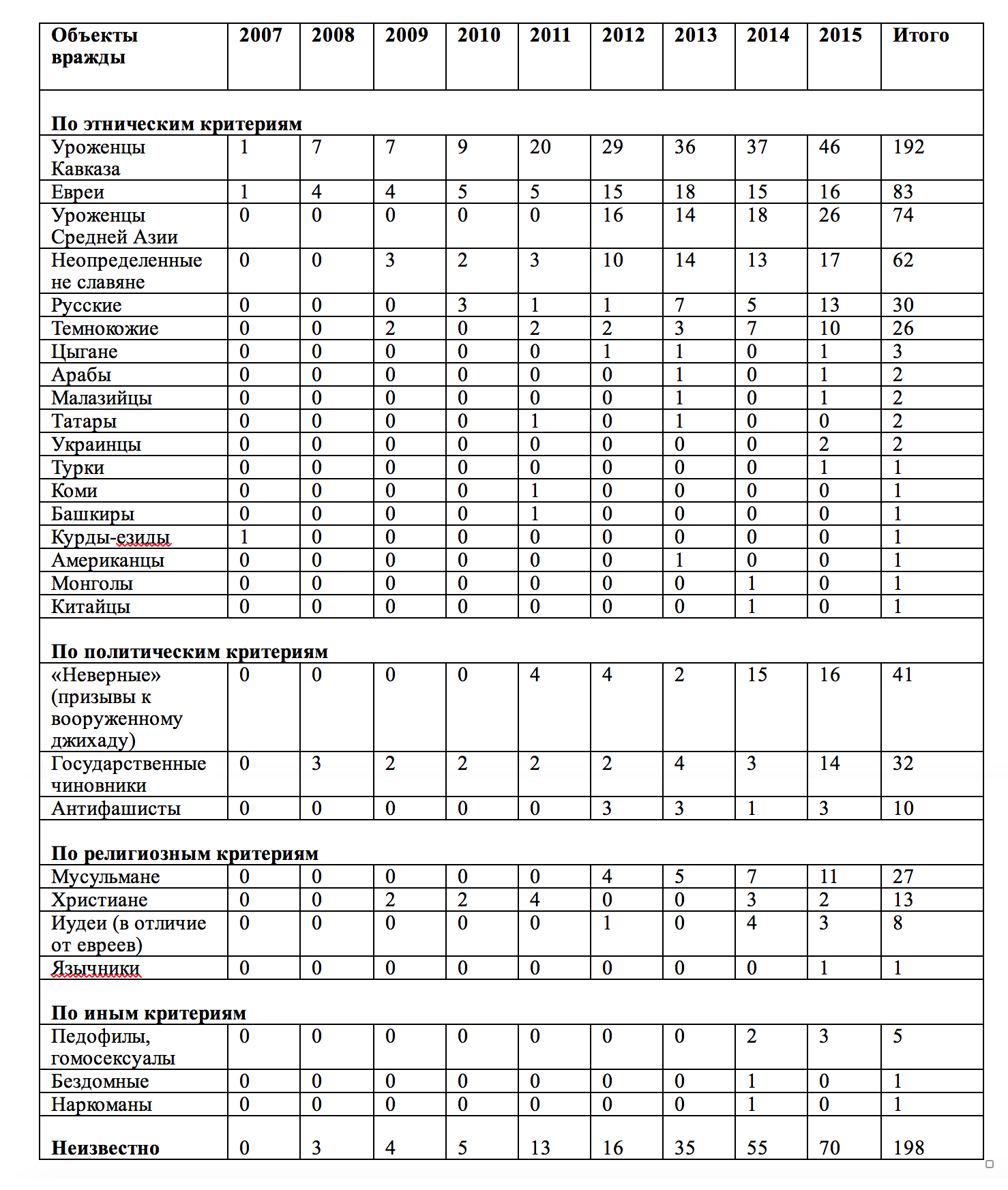 Там, где это было возможно, мы выделили следующие группы объектов вражды (в инкриминированных осужденным материалах могла выражаться вражда к нескольким группам):
