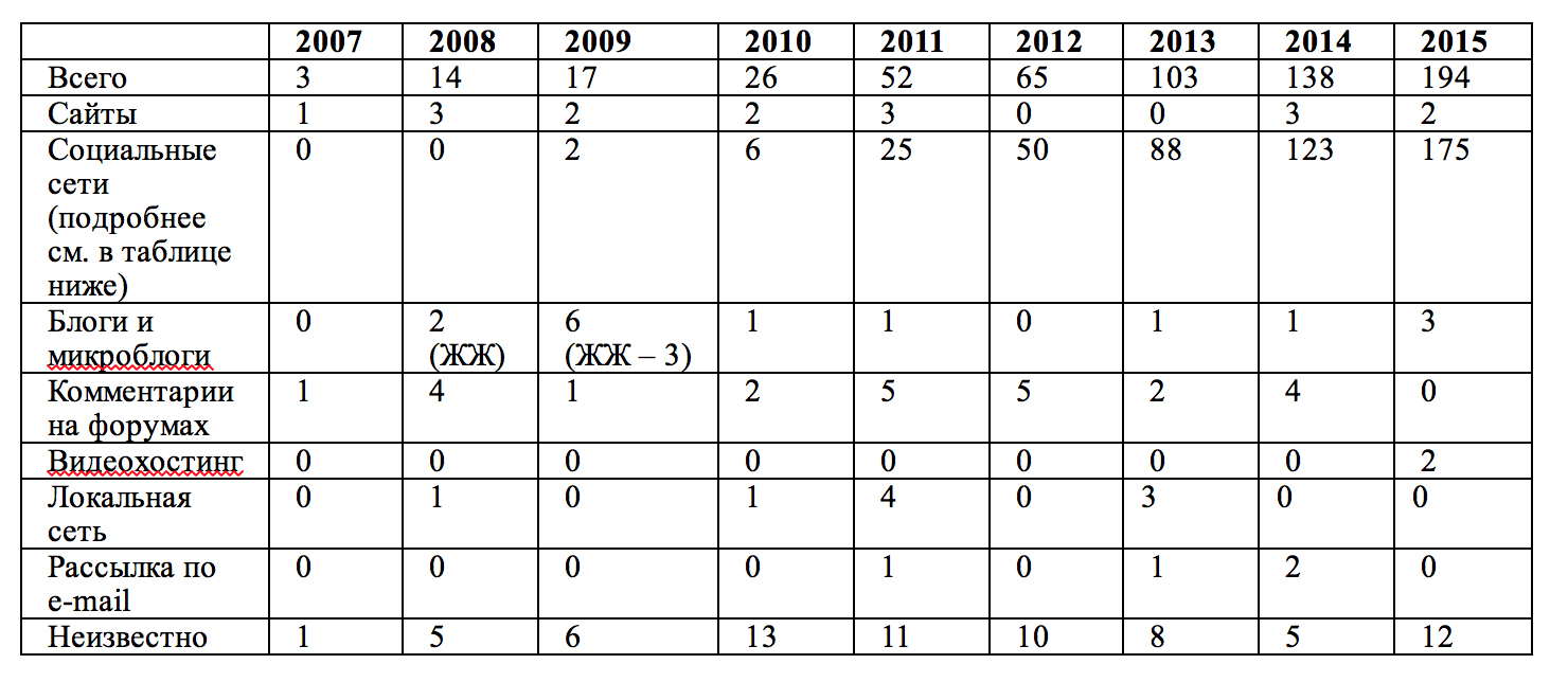Глядя на таблицу и график выше, следует, конечно, учитывать, что, например, относительно 30 % приговоров за соцсети за 2015 год мы не знаем, какая именно сеть имелась в виду. Но по тому, что мы знаем, это почти всегда была именно «ВКонтакте». Из остальных социальных сетей внимания правоохранителей в 2014 и 2015 годах удостоились лишь «Одноклассники» и Facebookxxii.