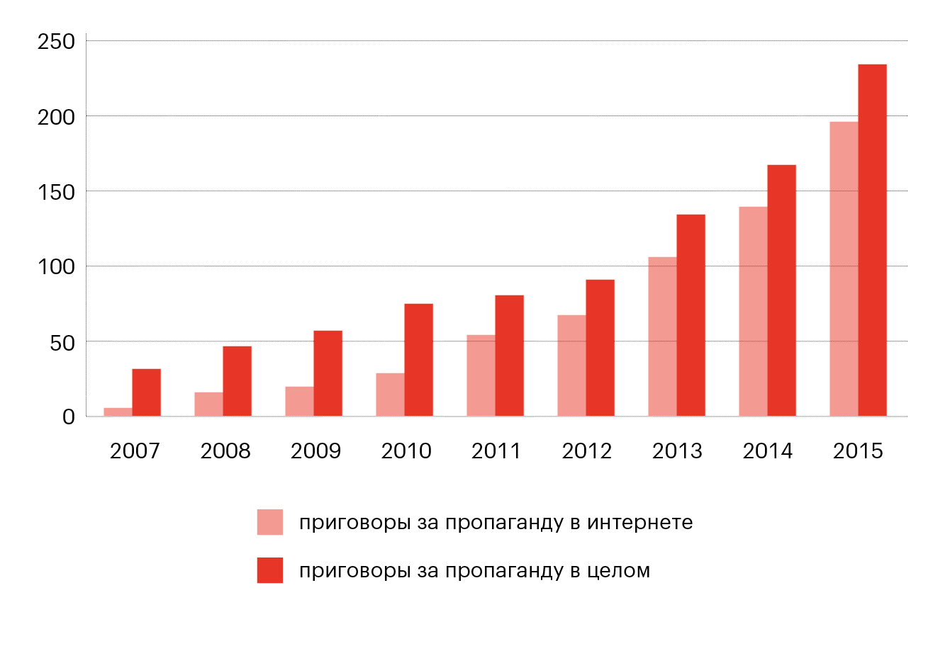 Применительно к интернету довольно часто используются такие статьи Кодекса об административных правонарушениях (КоАП), как ст. 20.3 («Пропаганда и публичное демонстрирование нацистской атрибутики или символики») и ст. 20.29 («Массовое распространение экстремистских материалов, а равно их производство или хранение в целях массового распространения»). За 2014–2015 годы количество решений по этим административным статьям увеличилось, хотя уголовных приговоров пока мы знаем большеxxxv.