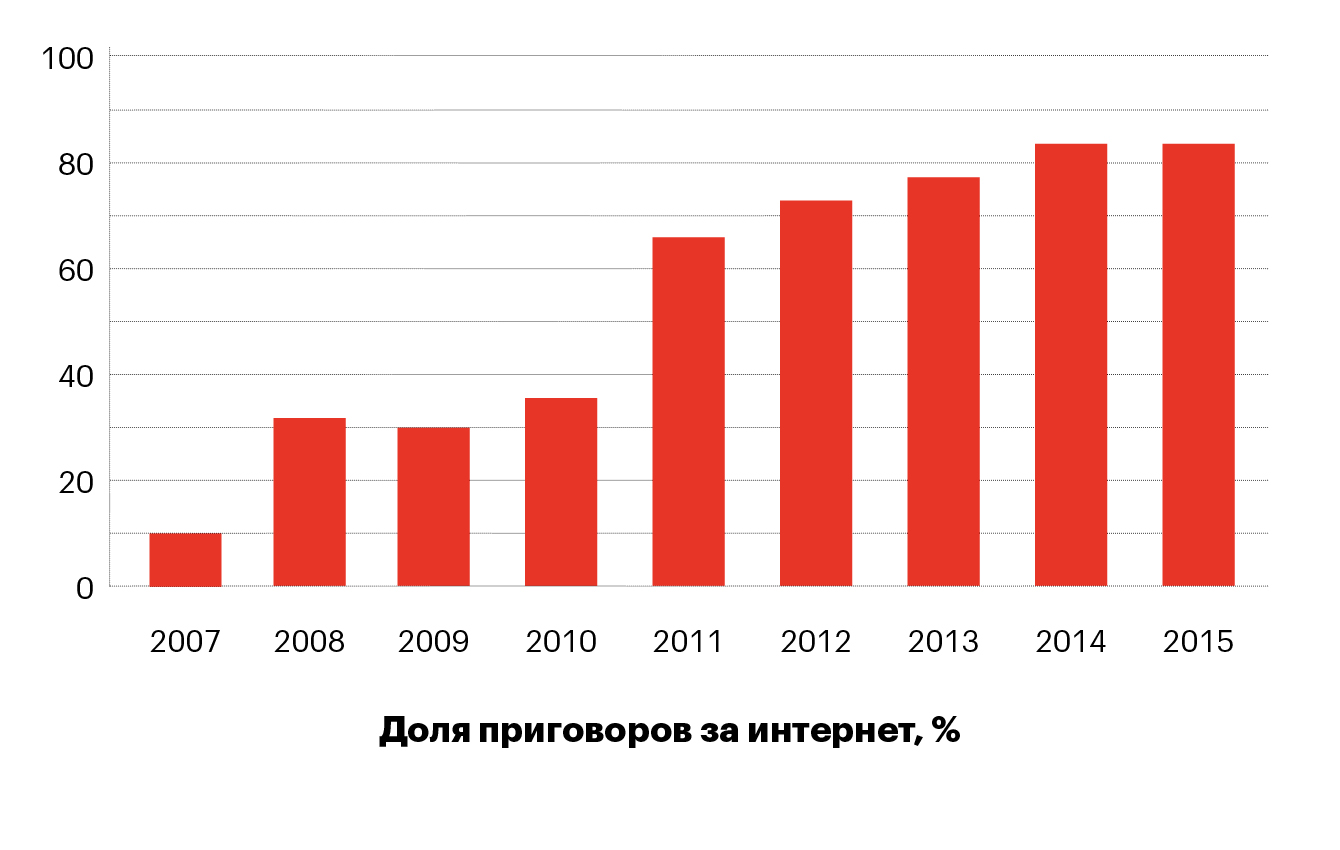 Таким образом, очевидно, что количество приговоров за «экстремистские высказывания» в целом растет с ускорением, а в интернете — особенно. На главную причину этого явления мы уже неоднократно указывали: это явная переориентация сотрудников правоохранительных органов на преследование тех, кого проще обнаружить и по кому легче оформить дело, ради наращивания антиэкстремистской отчетности. Механика расследования дел за пропаганду (в том числе и в интернете) уже несколько лет назад была достаточно хорошо отлажена, и расследование подобных дел стало простым и привычным. Впрочем, следует принять во внимание и рост числа пользователей интернета, возросшее значение Рунета как источника информации, средства общения и, конечно, политической агитации.