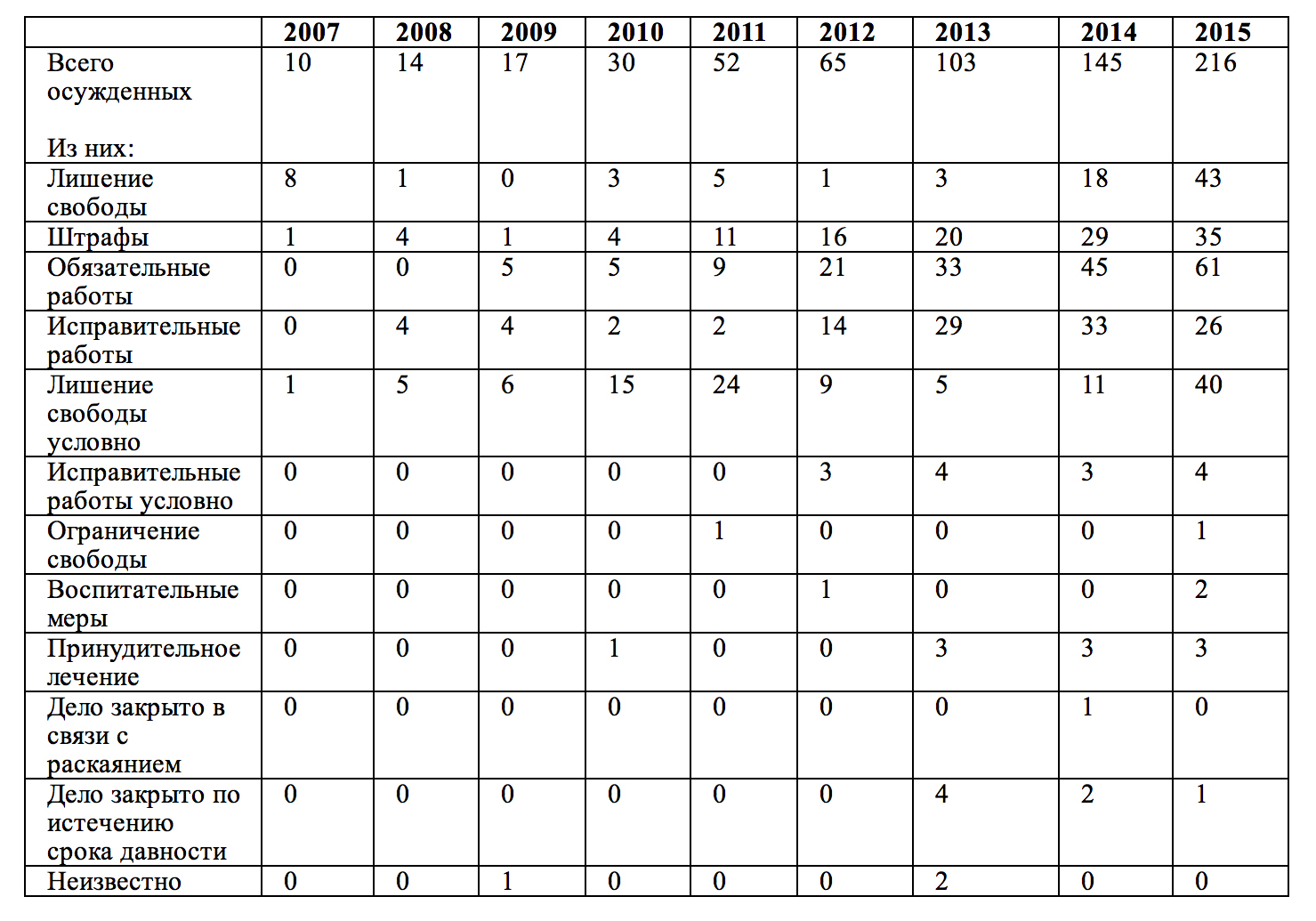 Аналогичные данные приводит ассоциация «Агора», по подсчетам которой, в 2015 году не менее 18 человек были приговорены к реальному лишению свободы, общим сроком на 36 лет 5 месяцевxxix (в тексте авторы не оговаривают, о какого рода преступлениях идет речь, однако из контекста и приведенных примеров видно, что имеются в виду «преступления экстремистского характера»). Из приговоров 2015 года два приговора к лишению свободы — левой активистке Дарье Полюдовой в Краснодареxxx и татарскому националисту Рафису Кашапову в Набережных Челнахxxxi — мы считаем явно неправомерными.