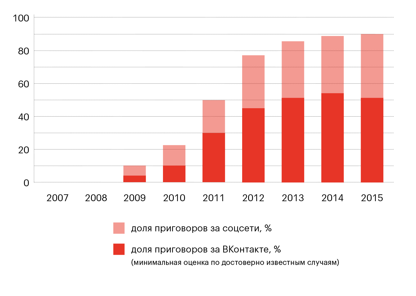 Среди этих сетей безусловно доминирует крупнейшая в России сеть «ВКонтакте»xxi. Наглядно это проиллюстрировано графиком ниже, где приведены в процентах доля приговоров за высказывания в социальных сетях по отношению к общему числу приговоров за высказывания и доля приговоров, вынесенных за публикации в социальной сети «ВКонтакте», по минимальной оценке, от того же общего числа приговоров.