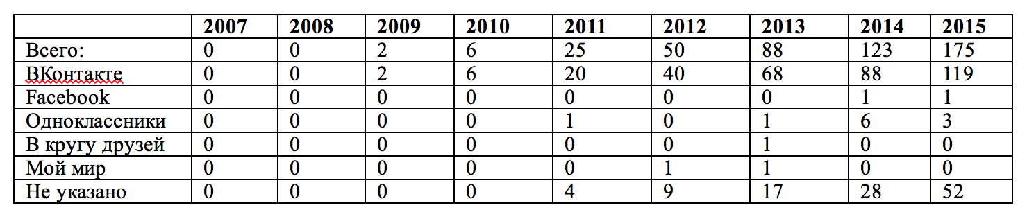 xix Не имеются в виду случаи, когда, например, автор «ВКонтакте» дает ссылку на Youtube. Эти случаи отнесены в строку «Социальные сети».