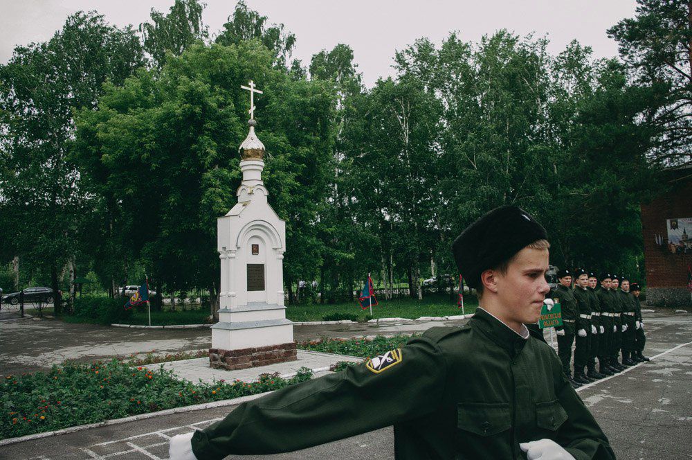 Во дворе казачьего кадетского корпуса стоит небольшая белая часовня в честь Георгия Победоносца. Около неё несколько ребят в форме защитного цвета и папахах с белым крестом репетируют маршировку.