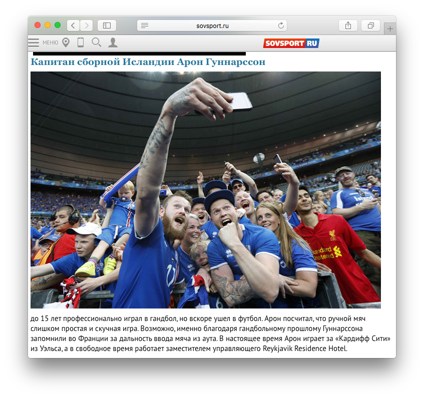 Известно, что у многих исландцев, которые выступают на Евро-2016, была когда-то вторая работа: кто-то был режиссером, кто-то — дантистом. Естественно, это не могло не породить гору шуток. Лучше всех пошутил российский блогер Сергей Д.: он взял фотографию другого блогера и выдал ее за снимок капитана сборной Исландии Арона Эйнара Гуннарссона. И написал, что в свободное время тот работает заместителем управляющего в гостинице.