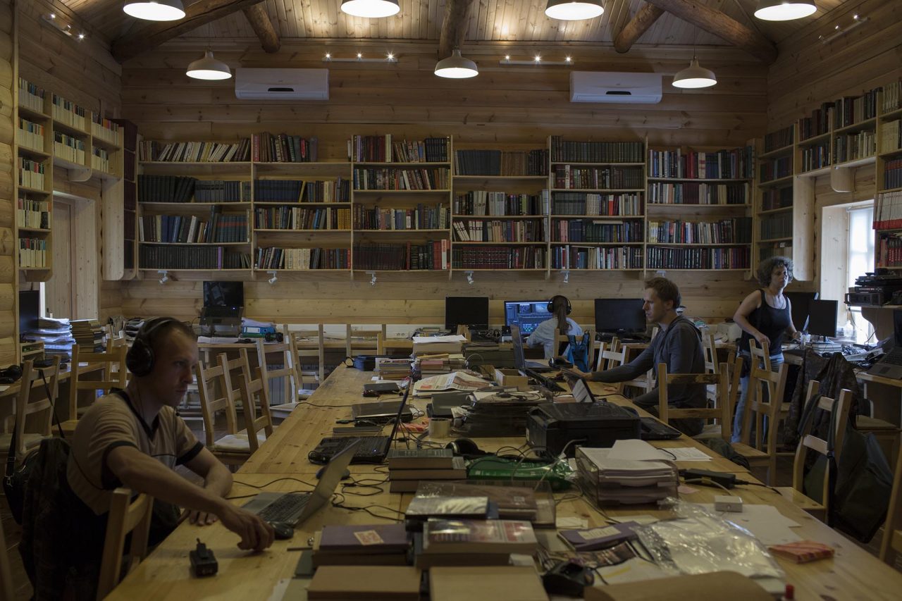 Устав от чрезмерно формальной экскурсии, я пытаюсь вырваться в поселок. До этого мне никак не получалось остаться без присмотра. Через пару часов меня отсюда увезут, и я хочу успеть пообщаться с местными. Но Андрей и его коллега по коммуне не отпускают меня одного и вежливо, но настойчиво предлагают меня сопроводить. По пути заходим в мозговой центр коммуны — деревянную избу с библиотекой и лекторием.