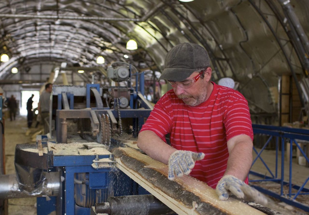 Рабочий основного цеха пилорамыФото: Ирина Емец для ТД Мы возвращаемся обратно на территорию базы. Под накрапывающим дождем рабочие загружают уже обработанные и высушенные в специальной сушилке доски. Материал готов к продаже. Коммунары рассказывают, что не так давно у них получилось выйти на самоокупаемость. В планах открыть еще одну лесопилку.
