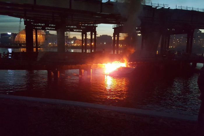 На Крестовском сгорел катер, врезавшийся в опору ЗСД
