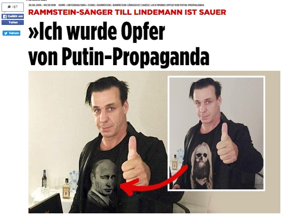 - Лидер немецкой группы Rammstein Тиль Линдеман обвинил российское агентство “Спутник” в том, что Путина на футболке ему прифотошопили, а цитату про сильного лидера – приписали. На футболке был не Путин, а череп.