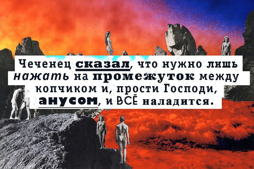 После нескольких часов слезоточивых историй наш спутник решился открыть нам правду. Даже так: ПРАВДУ. Первым откровением стал метод излечения Наташи от недельного то ли поноса, то ли запора (уже не помню точно) — чеченец сказал, что нужно лишь нажать на промежуток между копчиком и, прости Господи, анусом. Несмотря на дерзость, альтернативный метод помог подруге, о чём она публично и официально сообщила всем присутствующим после посещения туалета. Затем мужчина открыл нам глаза на наши сущности. Мне было сказано, что у меня есть все возможности крутить олигархами, чего я не делаю исключительно из-за своей наивности. Подозреваю, что на такую мысль нашего провидца навёл мой выдающийся бюст и светлые волосы. Довольно оригинально, ага.