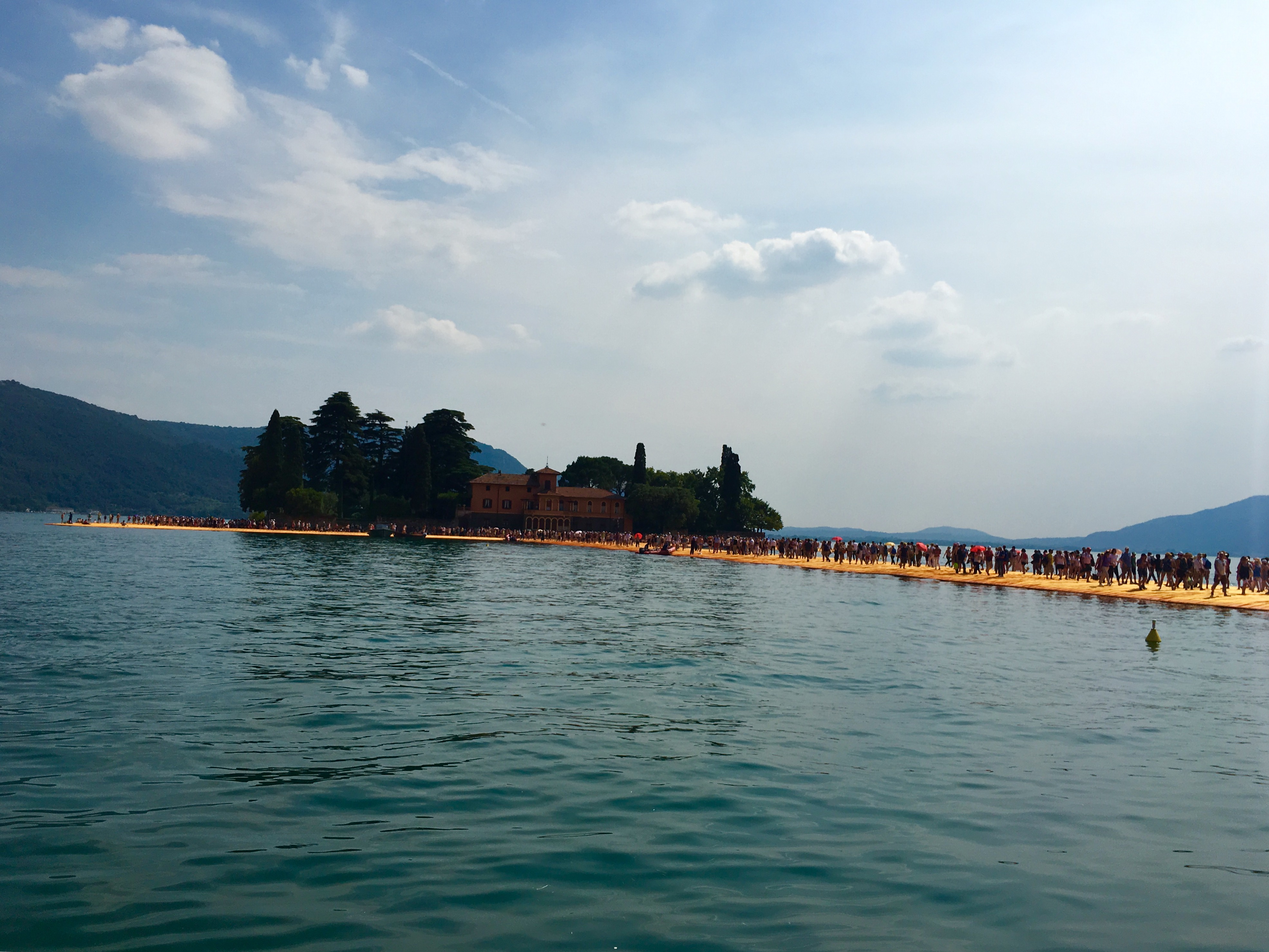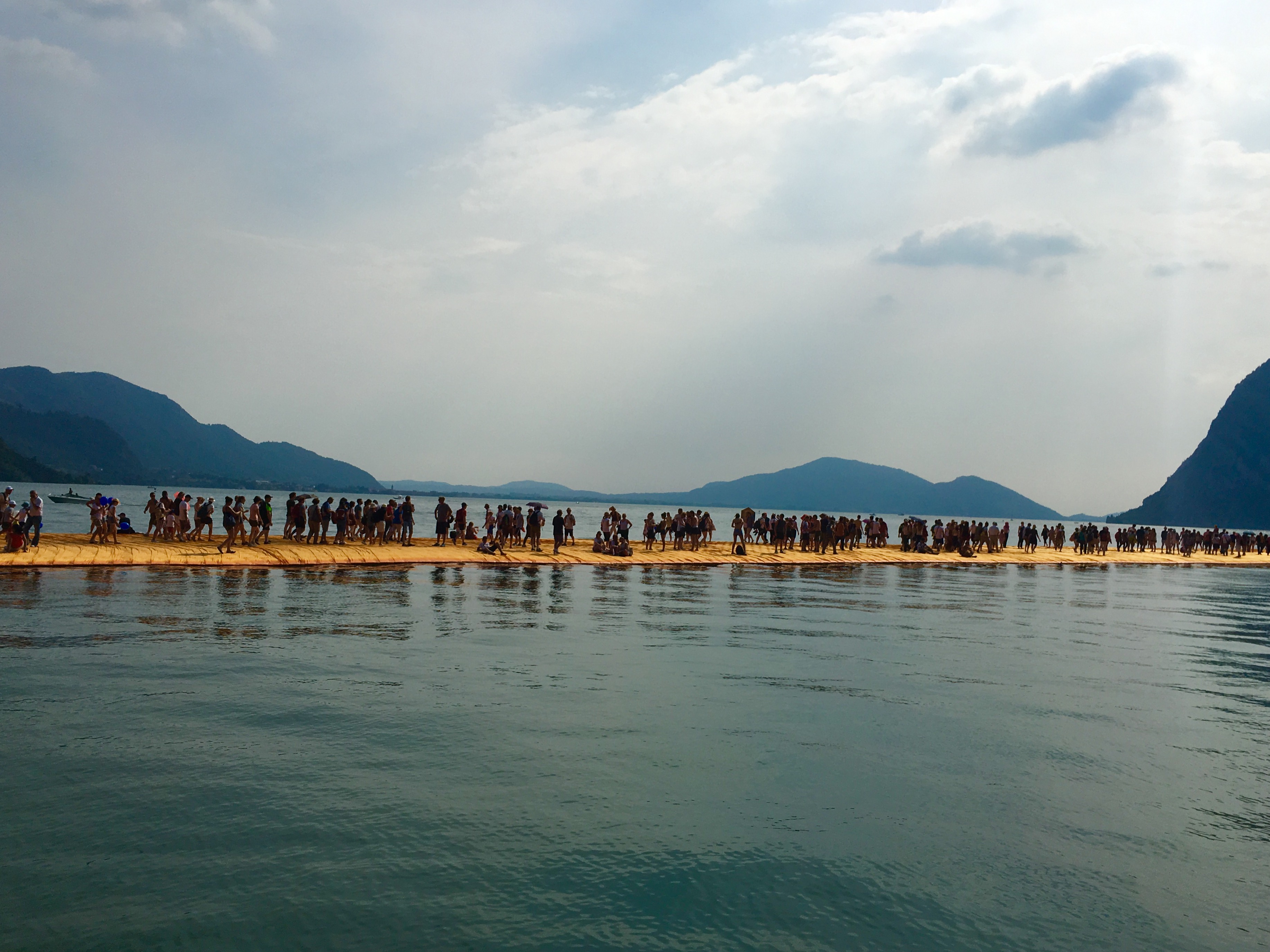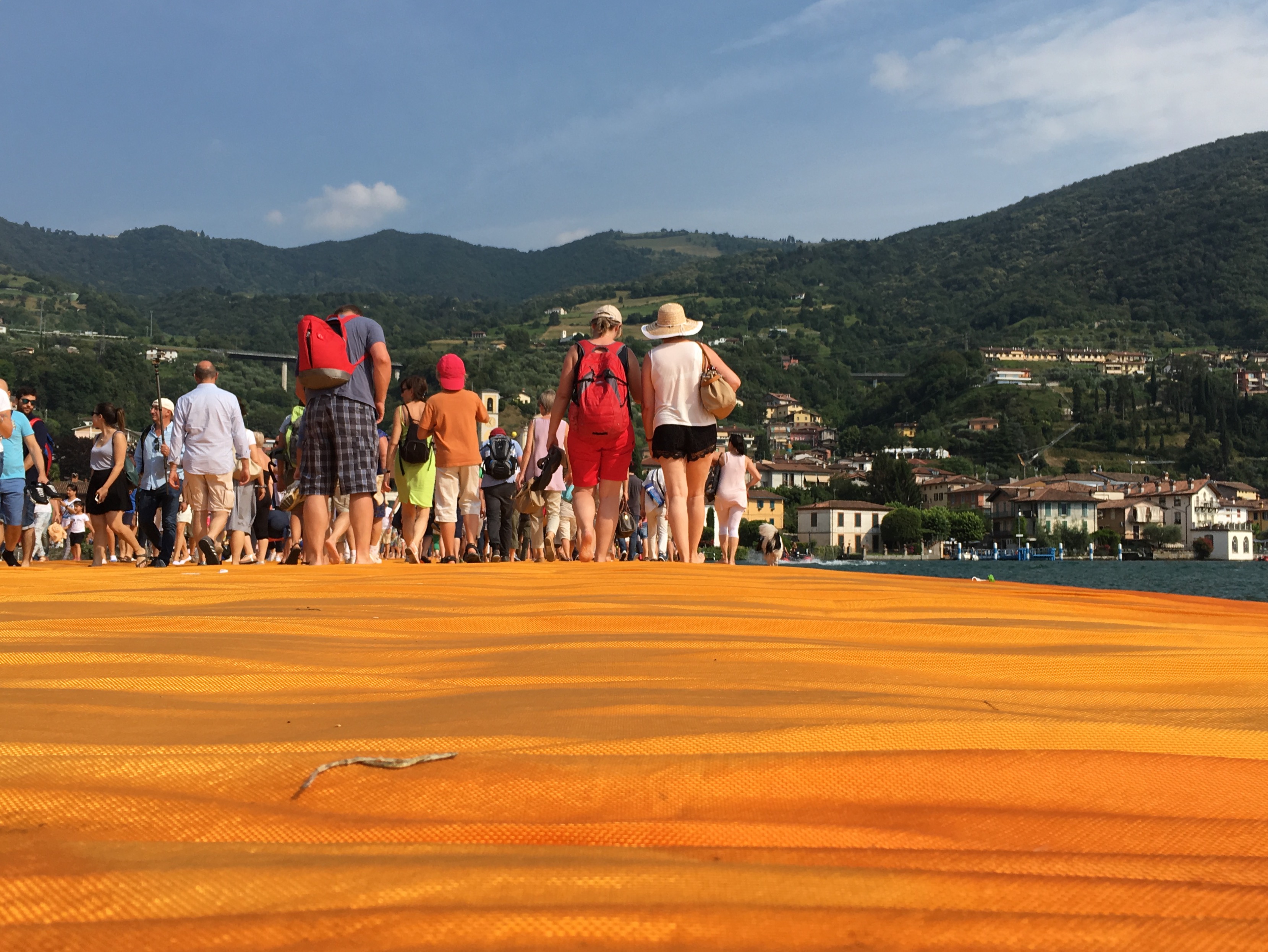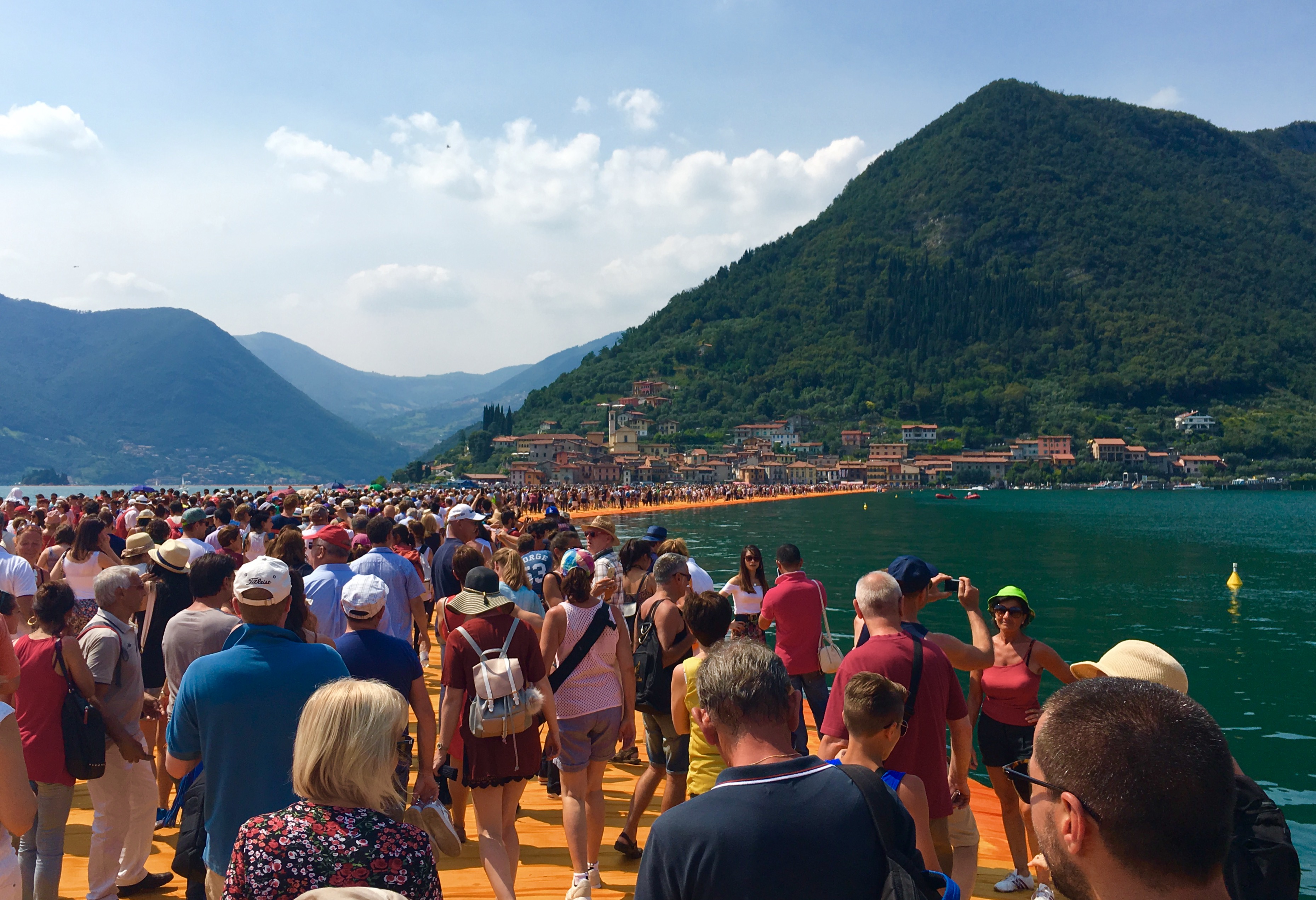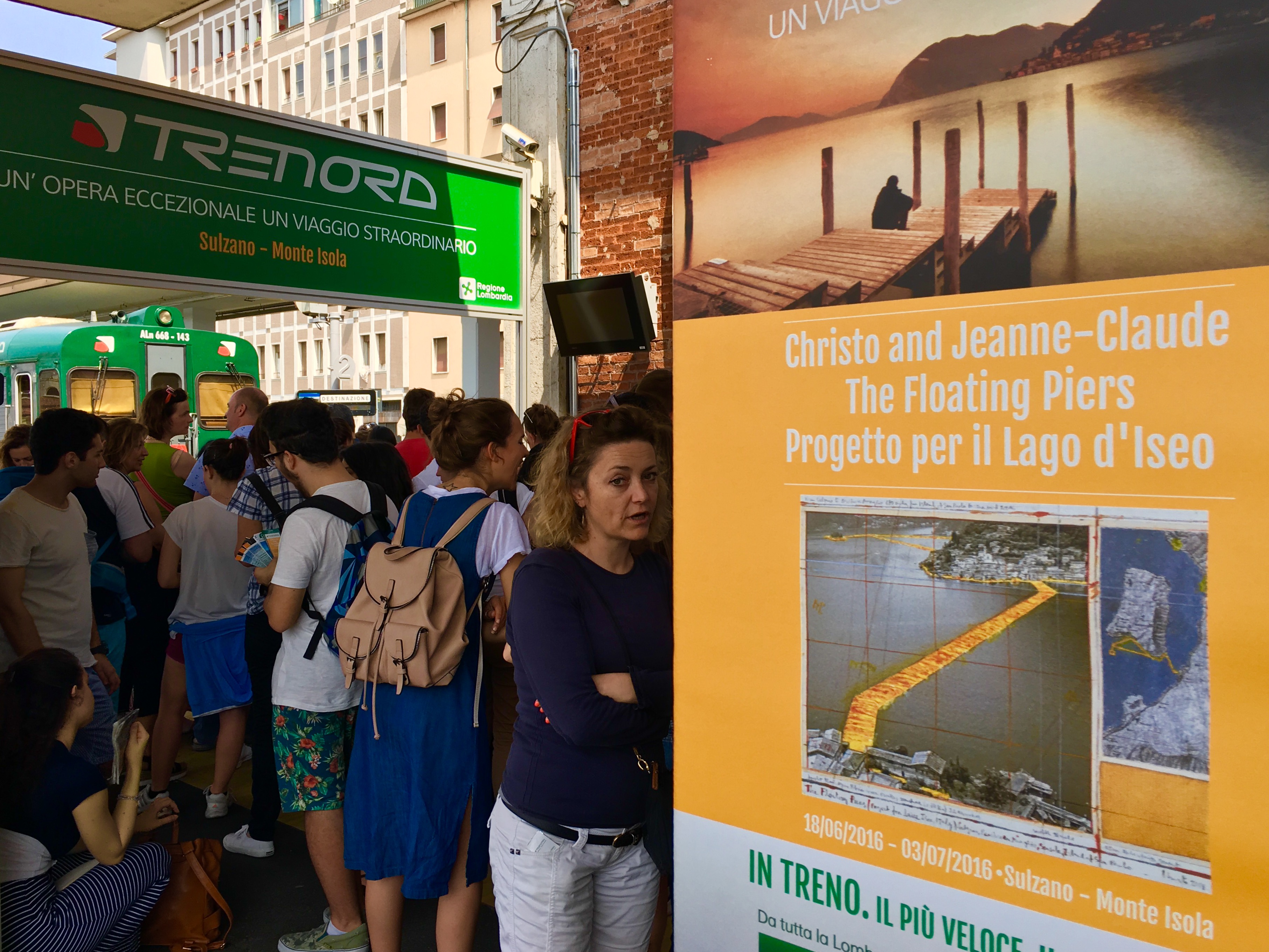 Оказавшись на вокзале в Брешии, откуда уходит поезд в Сульцано, я увидел толпу на одной из платформ и не сразу догадался, что все эти люди стремятся посмотреть на творение Христо. "Плавучий пирс" открыт всего 16 дней, вход бесплатный, и успех превзошел все ожидания: десятки тысяч паломников приезжают на Изео, чтобы пройтись по оранжевой дороге. Возможно, впервые в истории произведение современного искусства стало объектом столь массового поклонения.