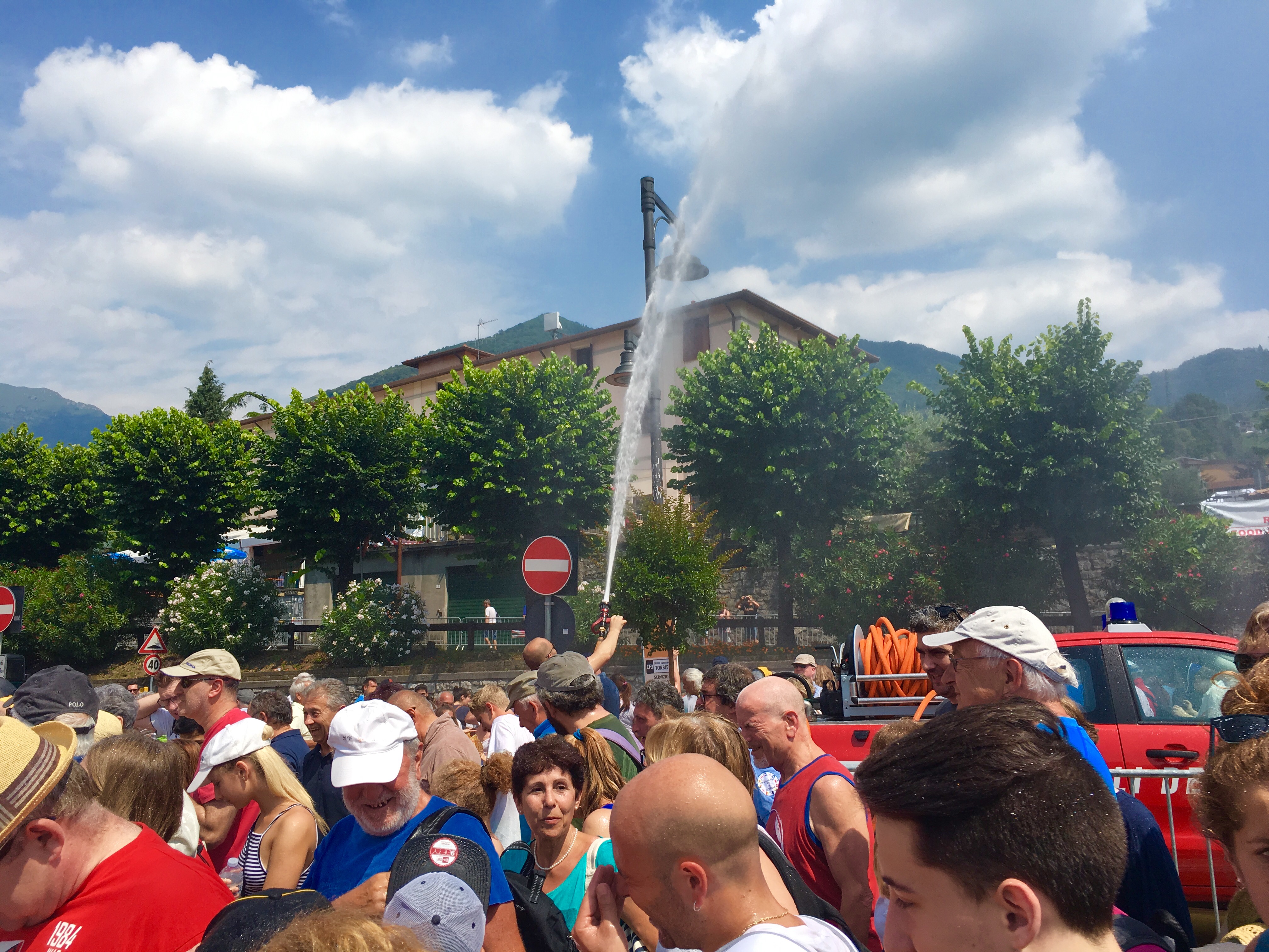 Оранжевая ткань, изрядно испятнанная, начинается в двух шагах от железнодорожного вокзала, и тут же возникает очередь. Стоять под палящим солнцем небезопасно, и самаритяне из местной пожарной команды подогнали свою красную машину и время от времени орошают паломников из брандспойта, направленного, к счастью, в небеса, а не прямо в толпу.