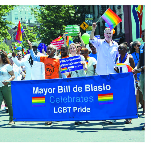 «Мэр Нью-Йорка Билл де Блазио приветствует ЛГБТ-прайд» — написано на транспаранте. Сам мэр — высокий мужчина (справа) с ЛГБТ-флажком в руках