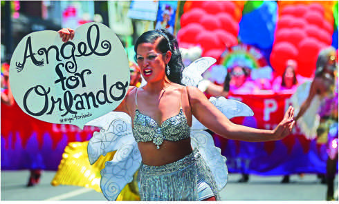 Участница парада, изображающая ангела, несет сердечко с надписью «Ангел для Орландо», Нью-Йорк, 26 июня 2016 года