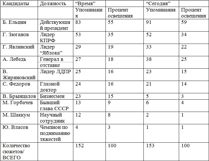 Американский профессор Сара Оатс детально проанализировала ход телевизионной кампании[26]. Из 152 сюжетов вечернего "Времени" на ОРТ, вышедших в эфир, отмечала она, во время первого тура 25% новостей были так или иначе связаны с президентскими выборами. Ельцин упоминался в 83 сюжетах (55%), а Зюганов – в 53 (35%). В дополнение, в 5% сюжетов присутствовали граждане страны, выражавшие поддержку Ельцину, отмечает Оатс. И хотя в 26 сюжетах из 152 (то есть в 17%) показывались другие кандидаты, зрители не могли узнать не только об из взглядах, но даже и о том, кто они – те просто мелькали в кадре, хотя иногда и с вкраплениями звука. В 4% этих сюжетов голословно утверждалась мысль о расколе в Коммунистической партии.