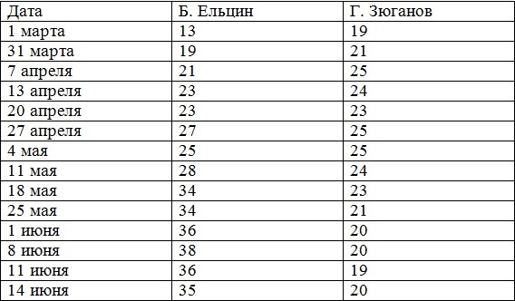 Динамика рейтингов Б. Ельцина и Г. Зюганова (1-й тур выборов)