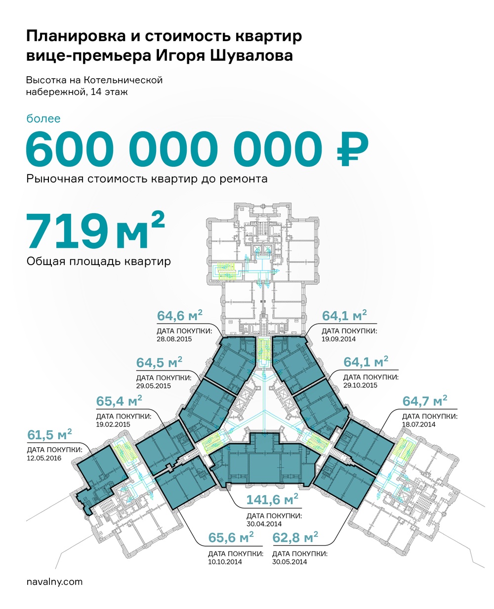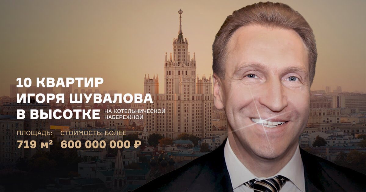 Первый заместитель главы российского правительства Игорь Шувалов владеет десятью квартирами в сталинской высотке на Котельнической набережной, рыночная стоимость которых оценивается более чем в 600 миллионов рублей. Об этом сообщил глава Фонда борьбы с коррупцией (ФБК), оппозиционер Алексей Навальный.
