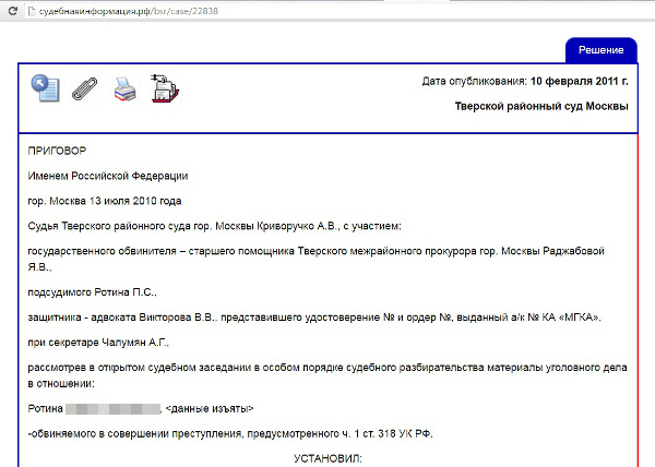 Информация о делах, поступивших в судебное производство до 28 февраля 2011 года. Скриншот с сайта Тверского районного суда г. Москвы Проблема с вынесением предупреждения «Судебным решениям РФ» в том, что вся информация там взята с сайтов российских судов, то есть из открытых источников. А значит, если там и была опубликована чья-то персональная информация, то раскрыта она была представителями судебной системы.