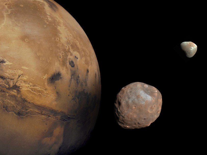 Марс со спутниками NASA Группа ученых предполагает, что спутники Марса Фобос и Деймос появились благодаря воздействию более крупного небесного тела – третьего спутника планеты, который через некоторое время после этого погиб из-за слишком большой близости к Марсу.