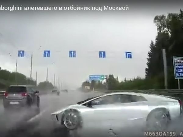 На кадрах видно, как дорогую иномарку во время дождя выносит на соседнюю полосу, после чего начинает крутить, из-за чего Lamborghini задевает машину, ехавшую рядом, а затем несколько раз врезается в отбойник.