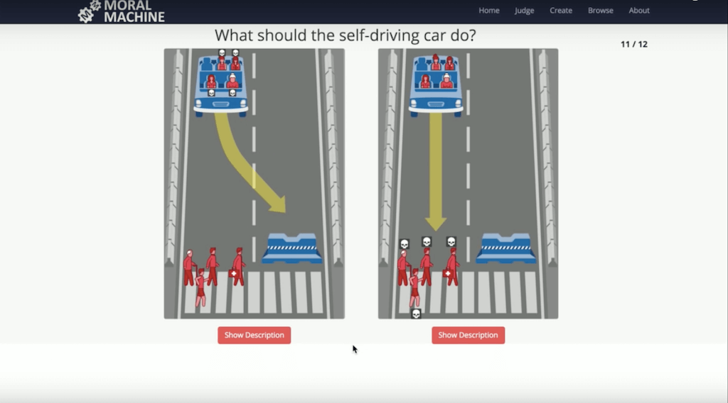 Moral Machine предлагает всем желающим пройти тест на моральную дилемму. Если машина на автопилоте попадает в ситуацию, когда неминуемо кто-то должен погибнуть – пассажиры или пешеходы, какой выбор она должна сделать? Как из двух зол выбрать меньшее – убить двух пассажиров или пять пешеходов? Как внешний наблюдатель, пользователь должен оценить, какое решение является более приемлемым. После прохождения теста можно сравнить свой ответ с ответами других людей.