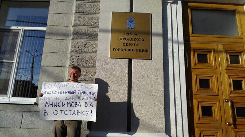 В Воронеже гражданский активист Виталий Иванищев провел 6 июля одиночный пикет у здания городской администрации с требованием отставки руководителя управления транспорта Владимира Анисимова, об этом сам активист рассказал на своей странице в Facebook.
