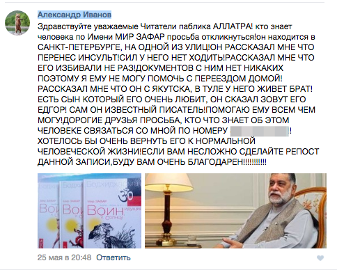 Студент — Инсульт у Зафара случился еще до встречи со мной. Он пожаловался на то, что у него болит сердце, и я вызвал скорую. Они его забрали, а через сутки я увидел Зафара на прежнем месте. Первый раз я его заметил, когда шел с тренировки, и он сидел под деревом. Был дождь, и я ему подарил зонт. Потом шел с учебы, кажется, было холодно на улице, подарил плед. Еще покупал ему продукты, сигареты. Мы начали общаться, он спросил: «Ты знаешь, кто я?» и рассказал про себя. Сказал, что у него есть дом и семья. Я разместил объявление во «ВКонтакте» и попросил о репосте, потом мое объявление появилось в «Одноклассниках». Начали звонить отовсюду: из Таджикистана, Узбекистана, Польши. Вчера мне пришло письмо из посольства Таджикистана с фотографией [Зафара], где он чистый, выбрит, переодет в свежую одежду. Я нашел его сына, который живет и работает в Иркутске. Он сказал, что снимает жилье и сам сидит без денег. Потом мне позвонила сестра Зафара, но она не могла к нему выехать: у нее тоже не было денег. И затем уже мне написал человек из посольства, который, видимо, и помог Зафару.Как рассказывает Sputnik, одним из первых на историю Зафара обратил внимание председатель комитета по культуре и коммуникациям РОО «Нур» Аслишо Акимбеков. Связавшись с другими членами таджикской диаспоры, он начал искать деньги на помощь Миру. Позже к спасению писателя подключилось и посольство Таджикистана. Откликнувшиеся обещают помочь Миру Зафару купить билеты домой.