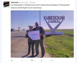 Напомним, 9 марта Нина Соловьева вместе с Виктором Чириковым сфотографировались на фоне стелы с надписью «Кущевский район» с плакатом в поддержку Дарьи Полюдовой, которая на данный момент отбывает наказание в новороссийской колонии за публикации в социальных сетях.