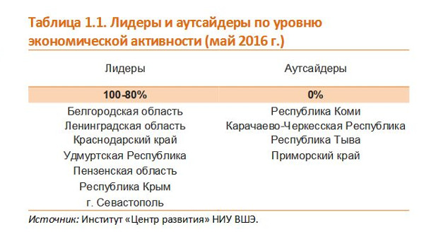 Авторы исследования обращают внимание на то, что доля регионов, в которых сокращаются все пять секторов экономики или растет только один из пяти, остается очень высокой, а значит текущее состояние российской экономики можно считать продолжением рецессии, хотя и не в самой острой ее стадии. Более того, распределение регионов по разным уровням экономической активности явно не дает особых поводов ожидать скорого завершения рецессии. В этом месяце появились четыре региона, где росли все пять секторов экономики; еще в трех росло по четыре сектора. При этом в четырех субъектах федерации сокращались все пять секторов из пяти.