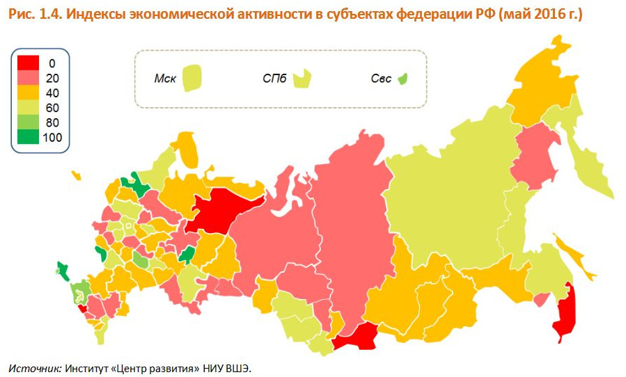 Инфографика: dcenter.hse.ruПолучилось, что с января 2015 года сводный индекс РЭА по стране ни разу не поднимался выше 50%, а в мае 2016 года оказался на уровне 42%, что, уверены эксперты, указывает на продолжение рецессии. Выше 50% сводный индекс оказался только в Крымском федеральном округе. А хуже всего дела обстоят на Северном Кавказе и на Урале.
