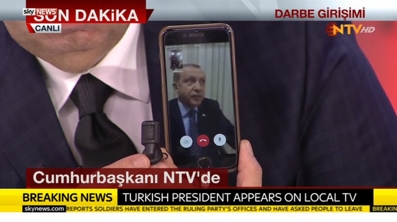 Частный турецкий телеканал показал президента Турции Реджепа Эрдогана, который, пользуясь мобильным телефоном, появился на экранах телезрителей и призвал граждан страны выйти на улицу и поддержать власть. Он назвал "меньшинством" тех мятежников в вооруженных силах, которые вышли из подчинения командования.
