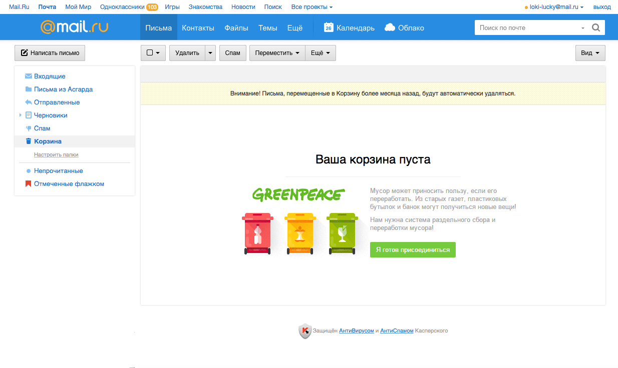 Гринпис России и Почта Mail.Ru запустили совместный спецпроект в поддержку раздельного сбора мусора. Когда пользователь сервиса очищает корзину своего почтового ящика, в интерфейсе появляется ссылка с призывом перейти на систему раздельного сбора и переработки мусора. Ссылка ведет на страницу с петицией Гринпис России за раздельный сбор и переработку отходов в России, под которой предлагается оставить свою подпись.