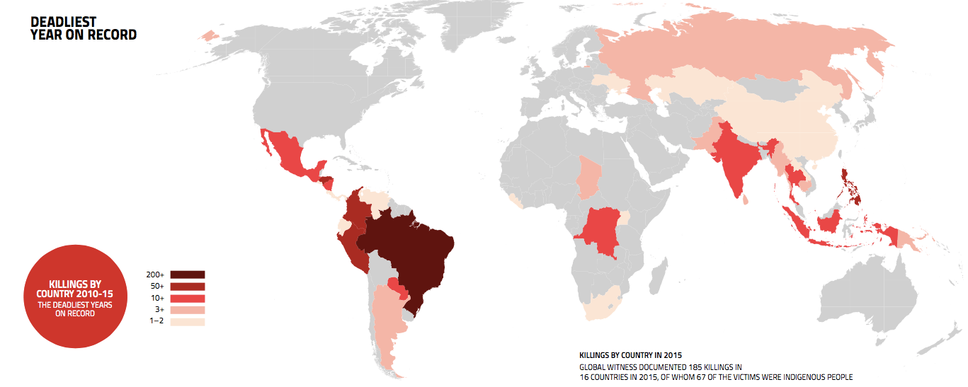 Согласно отчету организации Global Witness, в 2015 году почти каждые два дня в мире погибал один эко-активист. Из 185 убитых больше всего жертв пришлось на Бразилию – 50 человек. 2-е и 3-е места в отчете по количеству смертей занимают Филиппины (33) и Колумбия (26).