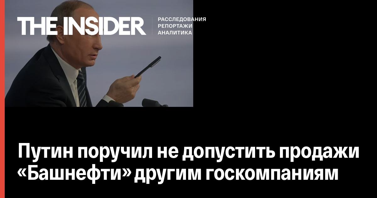 Владимир Путин поручил правительству не допустить продажи госкомпании «Башнефть» другим государственным компаниям: «Роснефти», «Газпрому» и другим. Об этом пишет РБК со ссылкой на источники в правительстве и на банковском рынке.