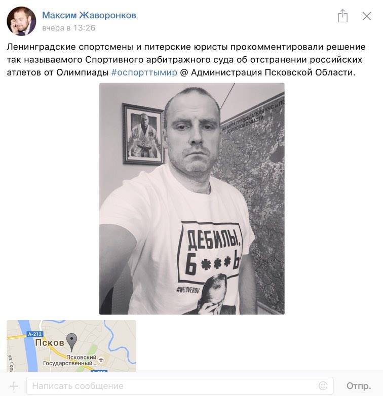 Заместитель губернатора Псковской области, руководитель аппарата администрации Максим Жаворонков в социальных сетях решил поддержать отстранённых от участия в Олимпийских играх спортсменов России и выказал недовольство и имперское безразличие к решениям Спортивного арбитражного суда. Многозначительное патриотичное фото Жаворонков выложил в соцсетях, снабдив комментарием: «Ленинградские спортсмены и питерские юристы прокомментировали решение так называемого Спортивного арбитражного суда об отстранении российских атлетов от Олимпиады». В своём сообщении вице-губернатор сделал отметку @Администрация Псковской области.