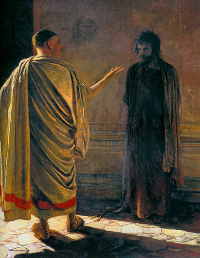 Николай Ге. Что есть истина? Модернистский художник — это мессия в каморке. Передвижники фактически помещают Христа Иванова в мир позднего Федотова, избирая для этого самые отчаянные сцены из Евангелия. Чаще всего это Гефсиманский сад, то есть место, где Иисус сомневается в своей вере, представая слабым и покинутым. Свое логическое завершение этот тип Христа получает даже не у Крамского, а у Перова в его картине 1878 года. Нельзя сказать, что Иисус в Гефсимании Перова молится — скорее он разбит сомнениями. Мы впервые в истории живописи не видим его лика — Христос уткнулся прямо в землю.