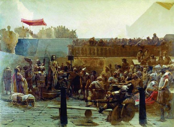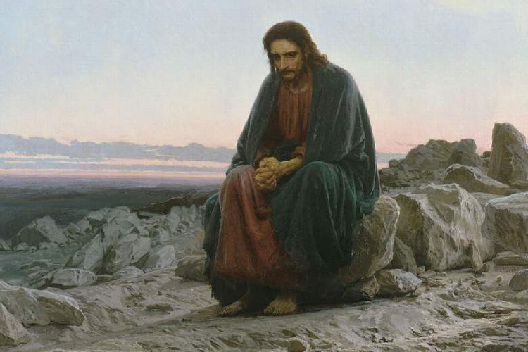Василий Перов. Христос в Гефсиманском саду Это самая депрессивная и реалистическая трактовка образа Христа. В картине «Что есть истина?» Ге Христос — анонимный исключенный, лишенный всех прав и голоса. Он предстает таковым в свете Закона Пилата. Крамской в работах «Христос в пустыне» и «Хохот» редуцирует Христа до человека, утратившего Бога. Именно комментируя эти две картины, Крамской напишет, что его Христос — атеист.
