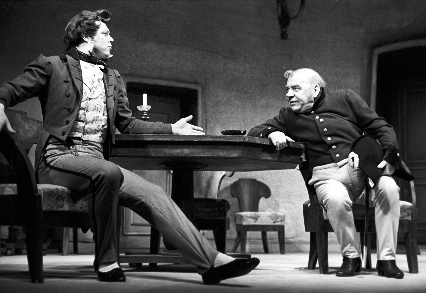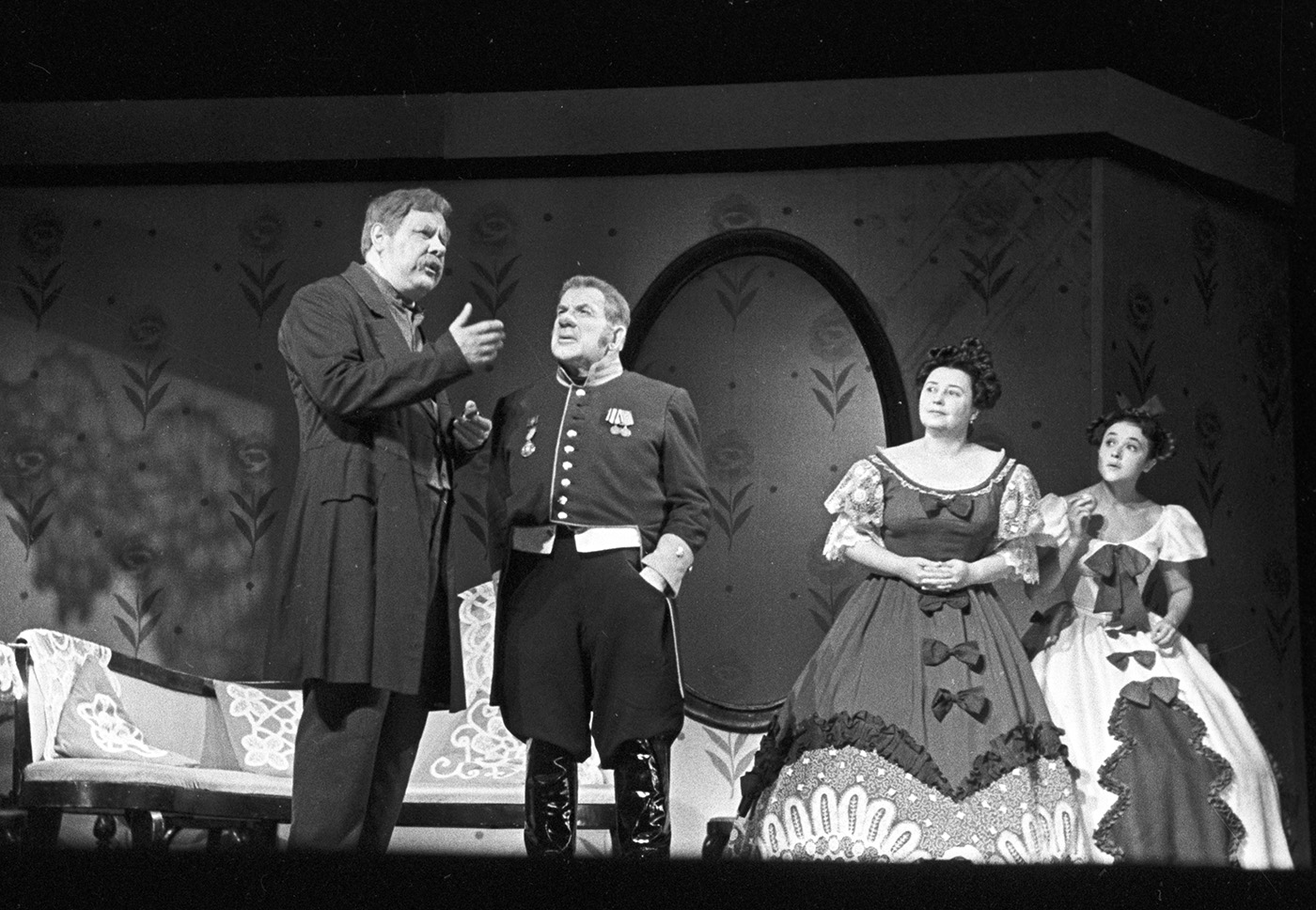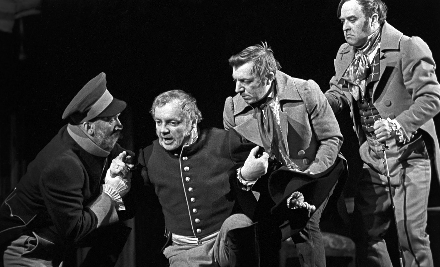 «Ревизор» Н.В. Гоголя на сцене БДТ. Постановка Георгия Товстоногова. Слева направо: Александр Андреев — пристав Уховертов, Кирилл Лавров — Городничий, Георгий Штиль — Добчинский, Михаил Данилов — Бобчинский. Фото: Максим Блохин / Фотохроника ТАСС.